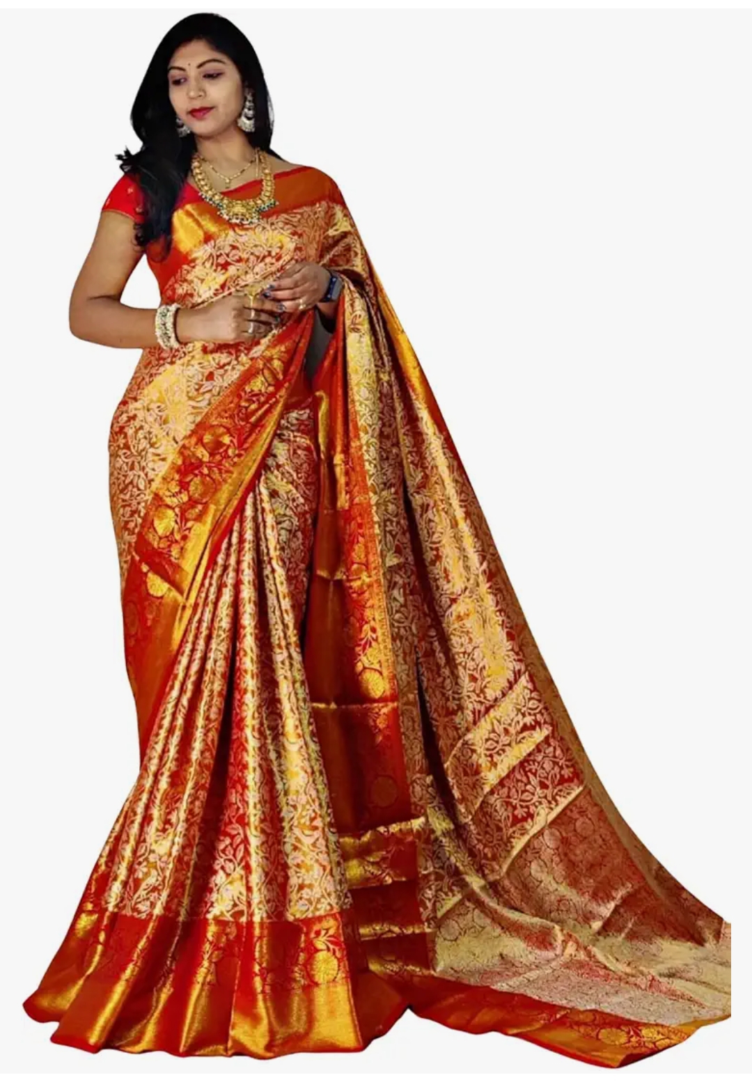 SGF11- Women's Kanjivaram Pure Soft Silk Handloom Saree Pure Golden Zari With Blouse Piece