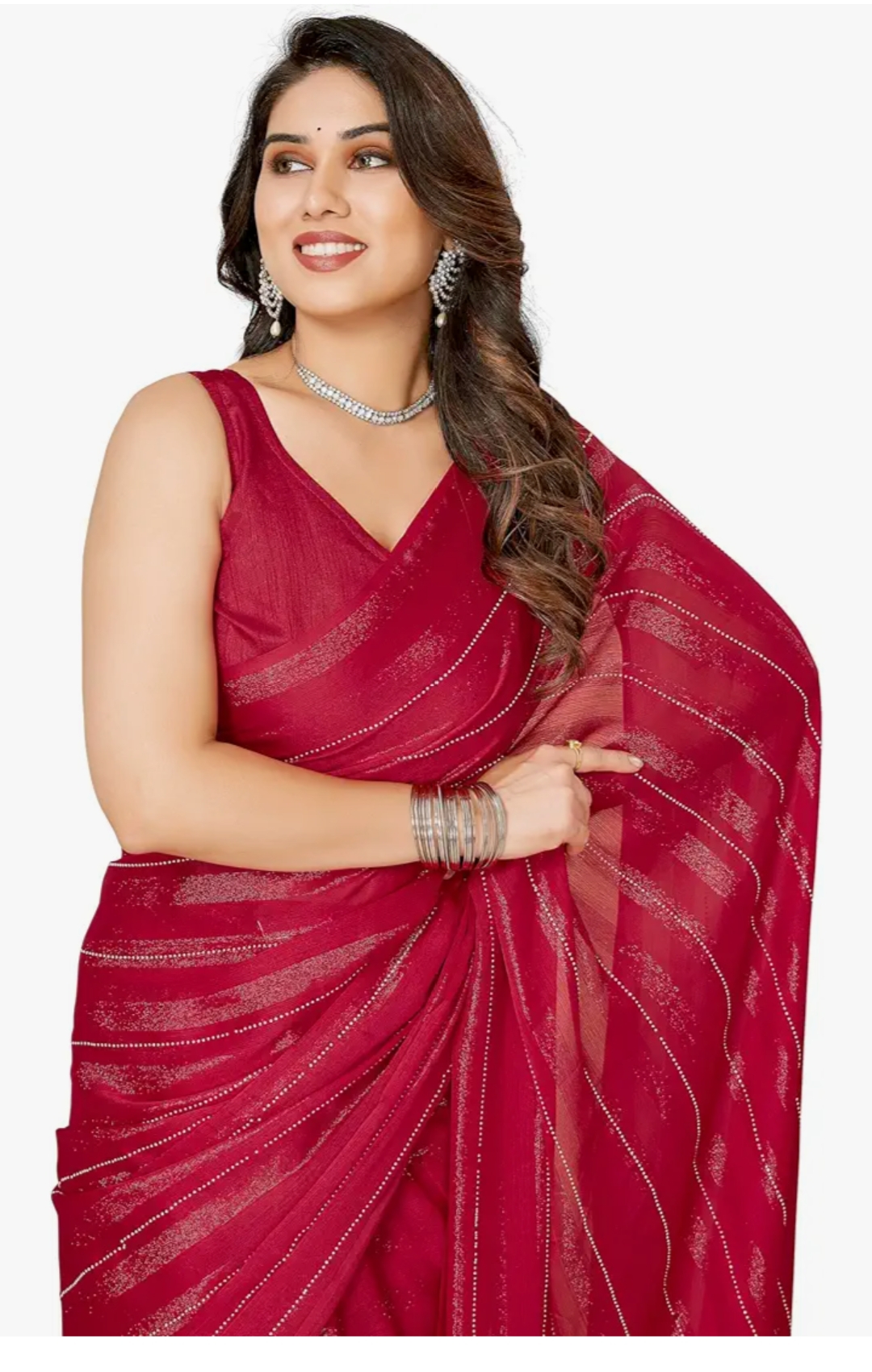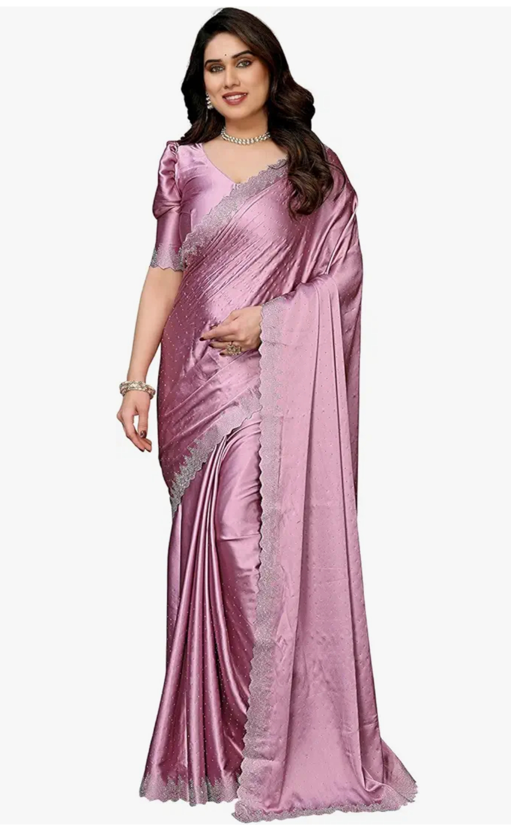 Yashika Women's Hot Fix Solid Color Satin Moss Saree with Unstitched Blouse Material