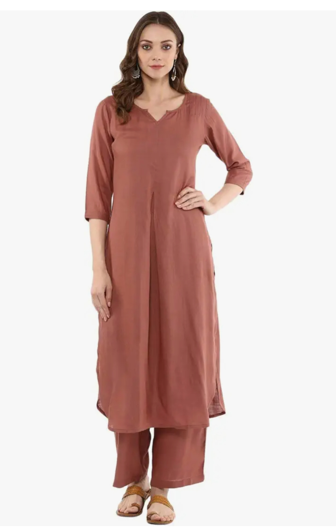idaLia Rayon Solid Straight Brown Kurta Set for Women with Palazzo 3/4 Sleeve, Round V Neck Designer Kurta with Palazzo Pant