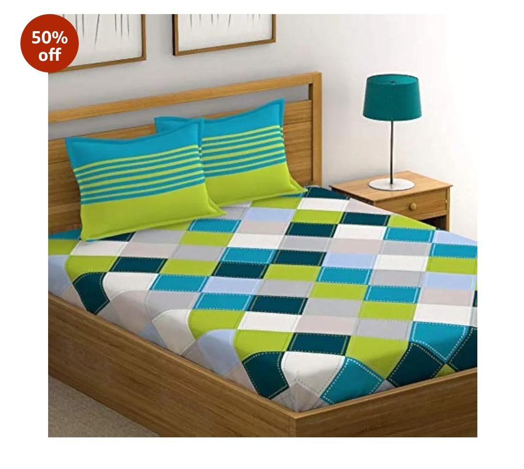 Huesland by Ahmedabad Cotton 144 TC Cotton King Size Bedsheet with 2 Pillow Covers - Blue, Green &