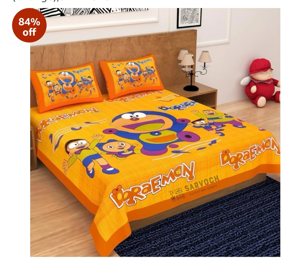Sarvoch Doraemon Theme 144 TC Cotton Double Jaipuri Prints Flat Bedsheet with 2 Pillow Covers