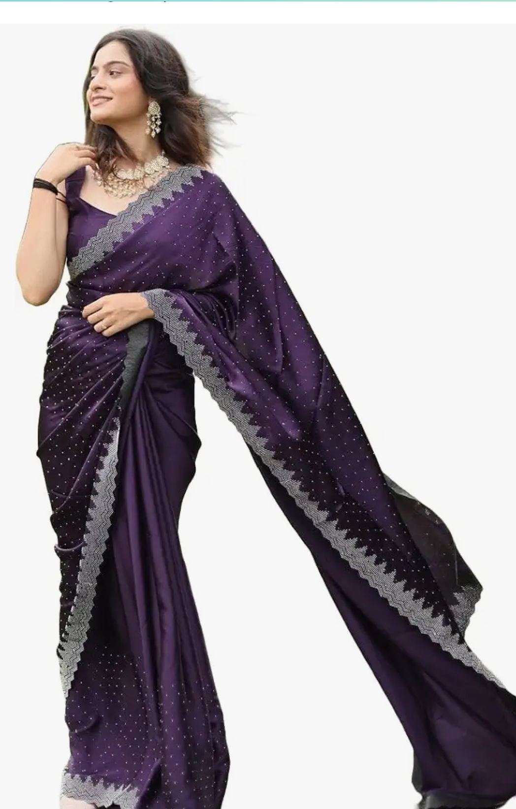 Yashika Women's Hot Fix Solid Color Satin Moss Saree