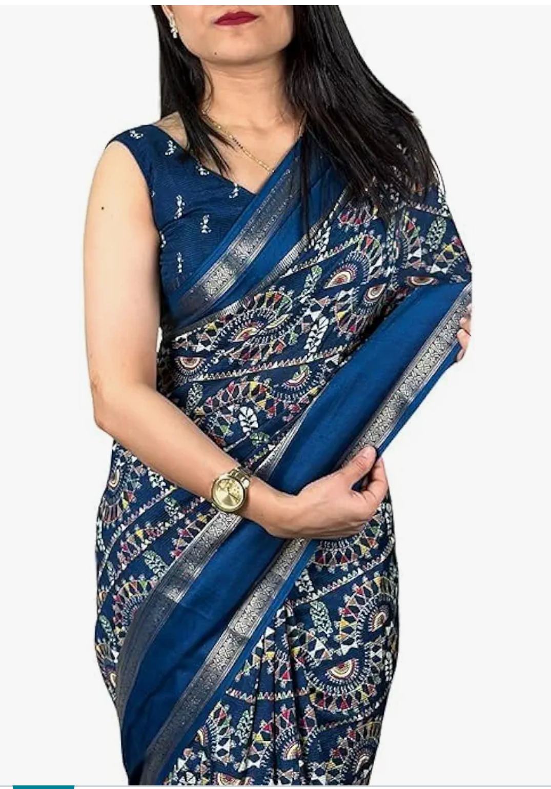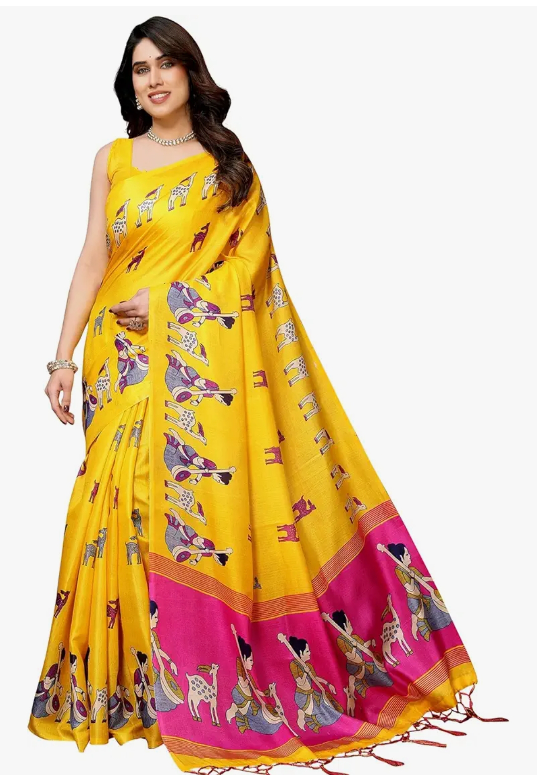 Yashika Women's Printed Kalamkari Art Silk Saree With Tassels and Unstitched Blouse Material
