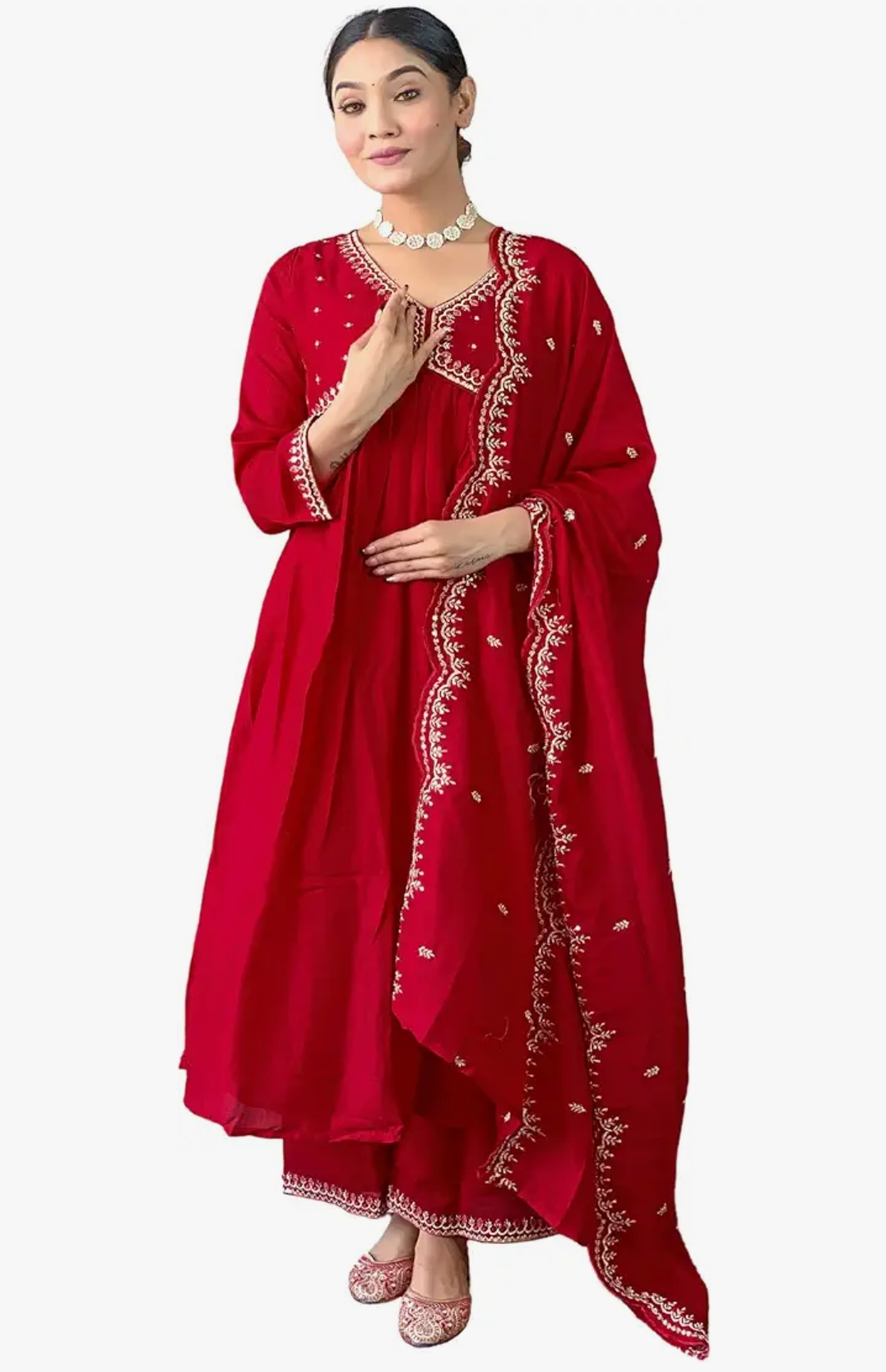 Naixa Women's Vichitra Silk Embroidered A-Line Kurta with Pant and Dupatta Sets (NK-443)