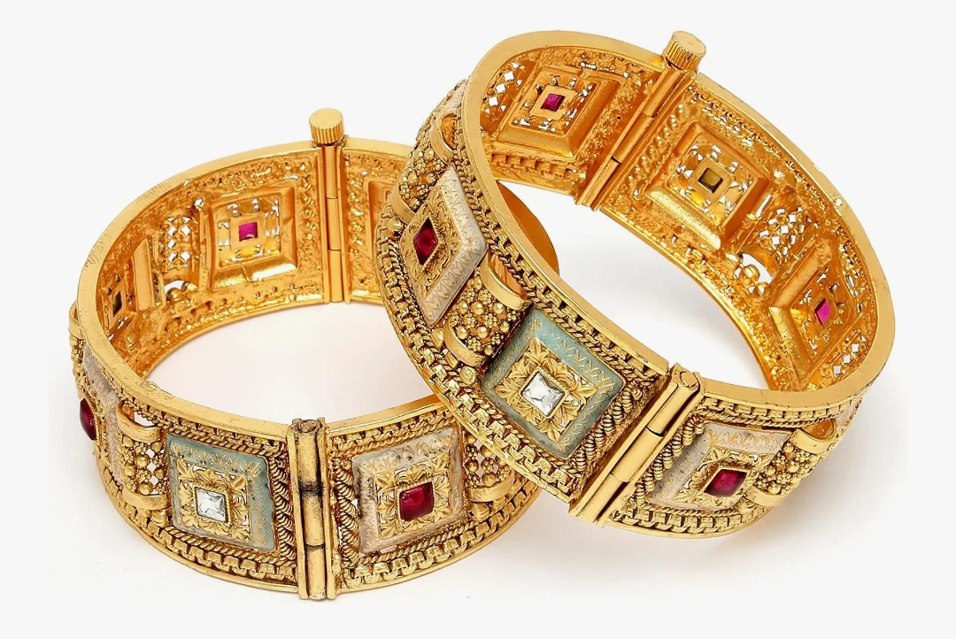 Karatcart Set of 2 Gold Plated Square Floral Design Multi Color Meena Bangles for Women