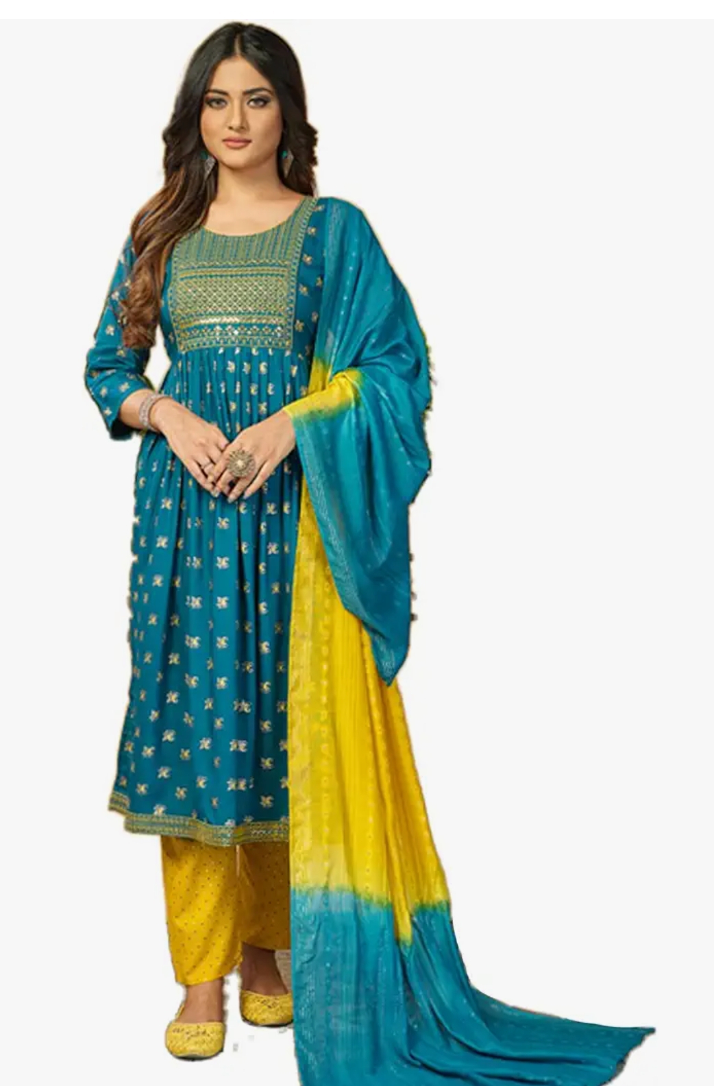 INDIMUSE Women's Embroidery Kurta Set with Straight Pants & Chiffon Dupatta - Elegant Traditional Ethnic Wear