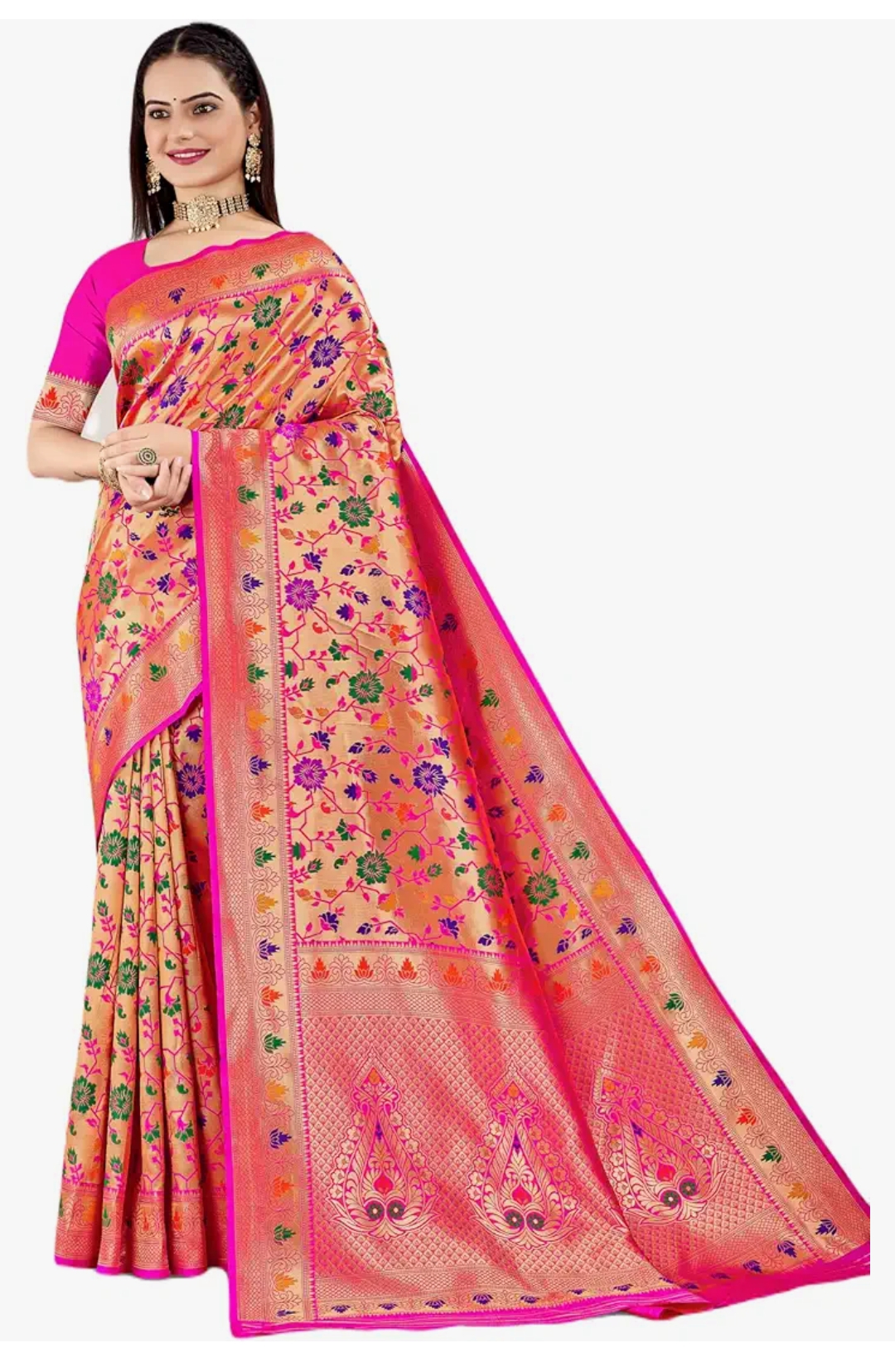 Jaanvi fashion Women's Paithani Silk Saree With Zari Work & Blouse Piece