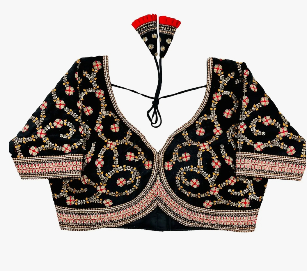 Pujia Mills Women's Velvet Heavy Codding Embroidery with Sequins Work Sweetheart Neck Half Sleeve Blouse